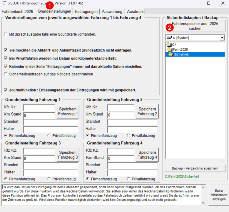 Sie können jeden zurückliegenden Datensatz korrigieren. Die aktuelle Rechtsprechung hat sich eindeutig darauf festgelegt, dass jede Änderung als solche kenntlich gemacht werden muss. Es kann jetzt jeder Datensatz korrigiert werden. Der Original-Datensatz wird als „storniert“ gekennzeichnet und die Korrektur wird als neuer Datensatz eingefügt. Die Korrektur wird mit Änderungsdatum gespeichert. Dieser Umstand kann dazu führen, das ein nicht zeitnah geführtes Fahrtenbuch offengelegt wird. Sie sollten aus diesem Grund so oft wie möglich eine Sicherheitskopie anfertigen.