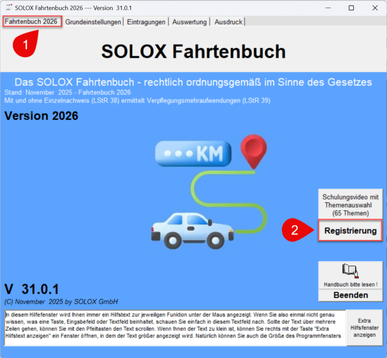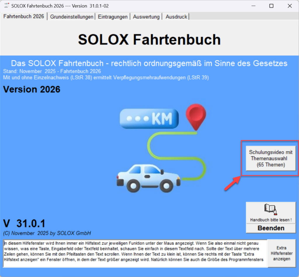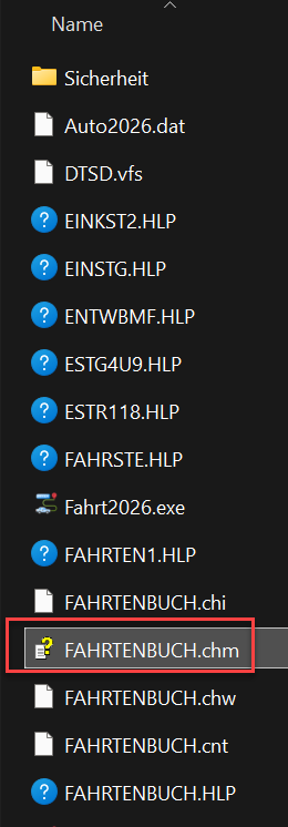 Bitte öffnen Sie hierzu die Datei „FAHRTENBUCH.chm“ aus dem Verzeichnis „Fahrt20xx“. Die Schaltfläche „Handbuch“ auf der ersten Seite „Fahrtenbuch 20xx“ funktioniert nur bis Windows 10. Wir arbeiten an einer Lösung.