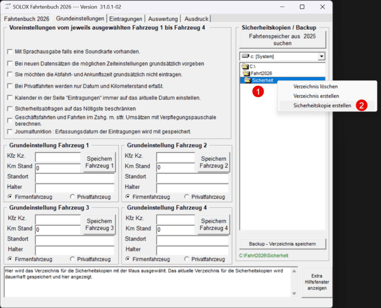 Bitte klicken Sie auf der Seite „Grundeinstellungen“ mit der rechten Maustaste auf den gewünschten Ordner. Es öffnet sich das Kontextmenü. Dort wählen Sie bitte „Sicherheitskopie erstellen“ aus. Anschließend wird eine Sicherung mit den aktuellen Daten erstellt.